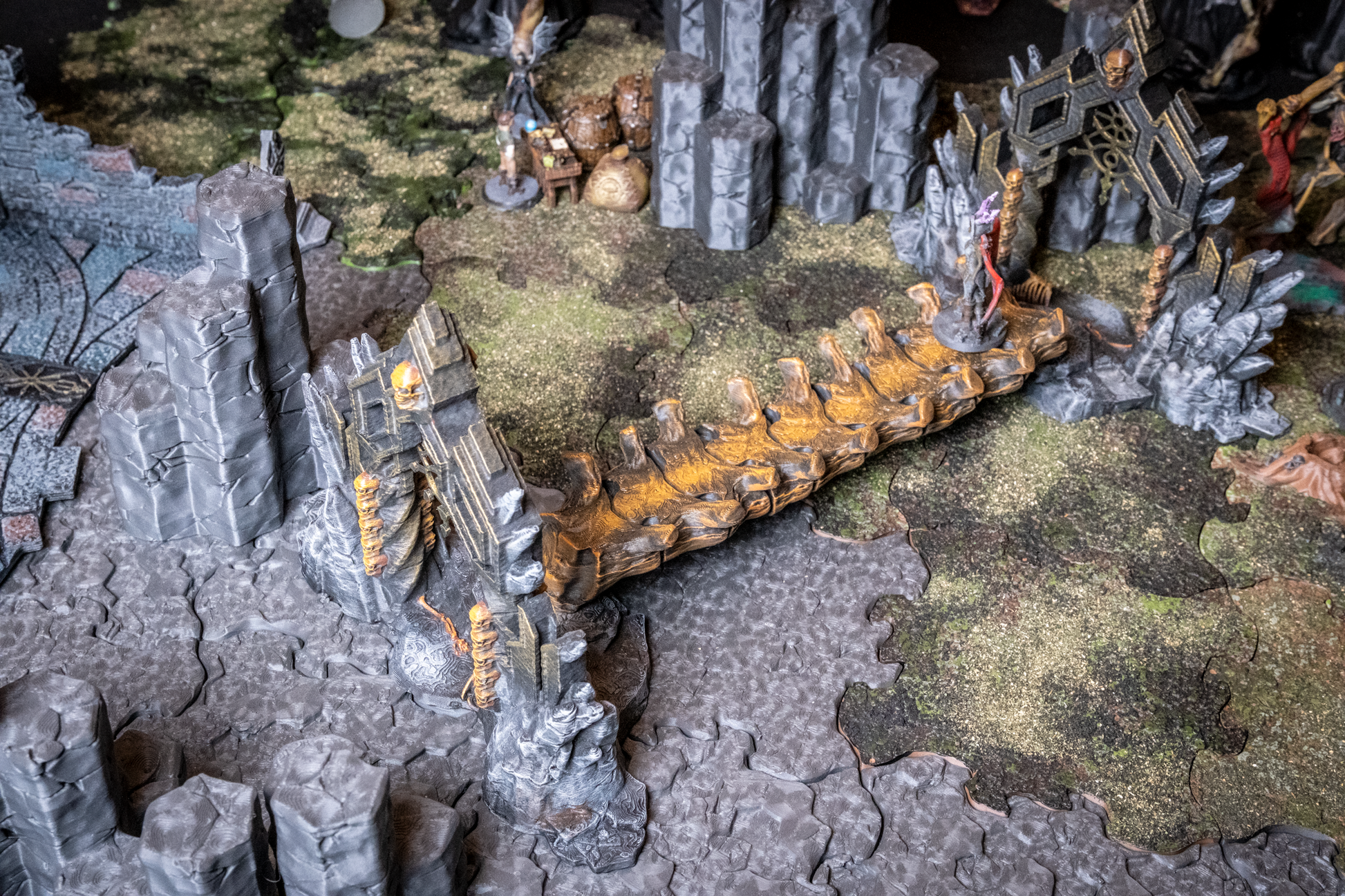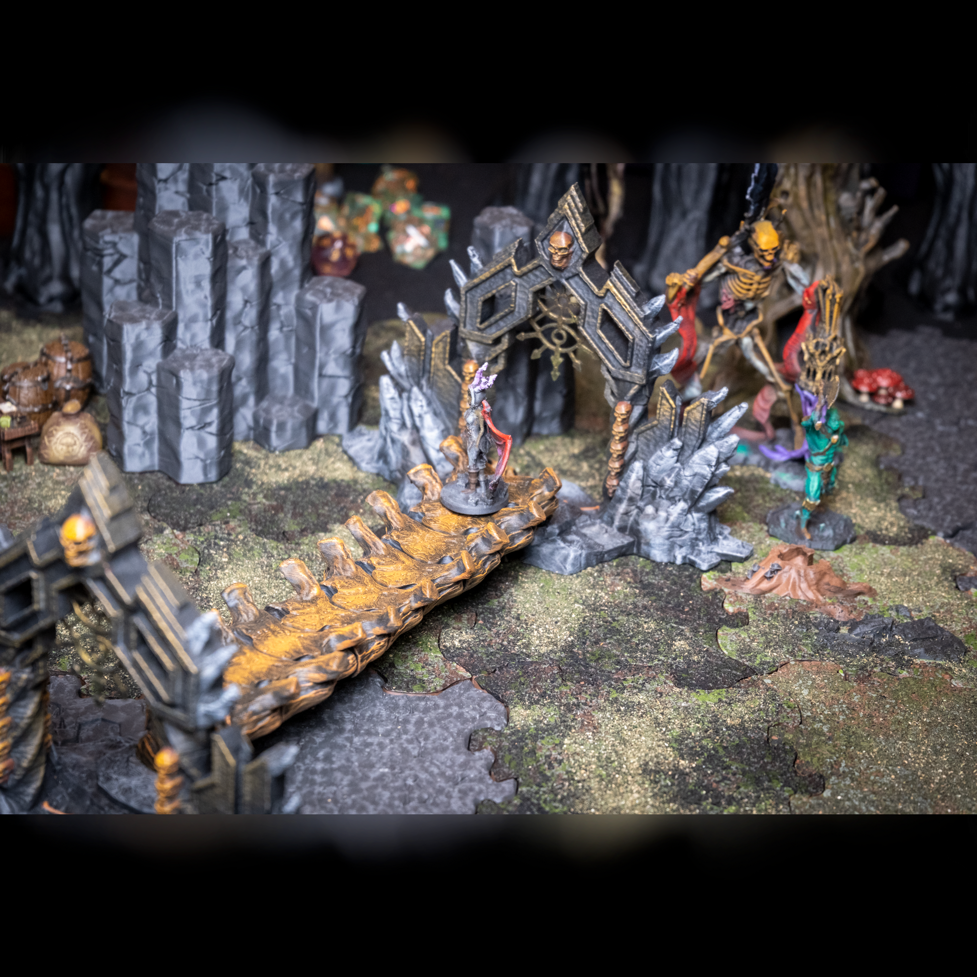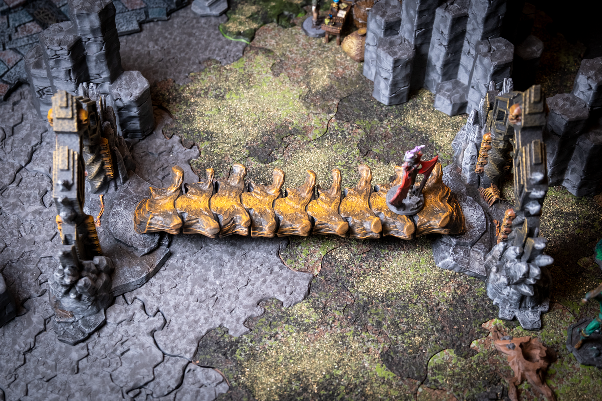 Crafted from the remains of a long-dead ancient dragon, the Bone Bridge spans chasms of shadow and flame with eerie grandeur. Each rib-like arch and spine-textured beam evokes the remains of ancient beasts—or something far worse. This haunting centerpiece adds instant tension and dark mystique to your tabletop. Ideal for Necromancer lairs, cursed catacombs, underworld crossings.