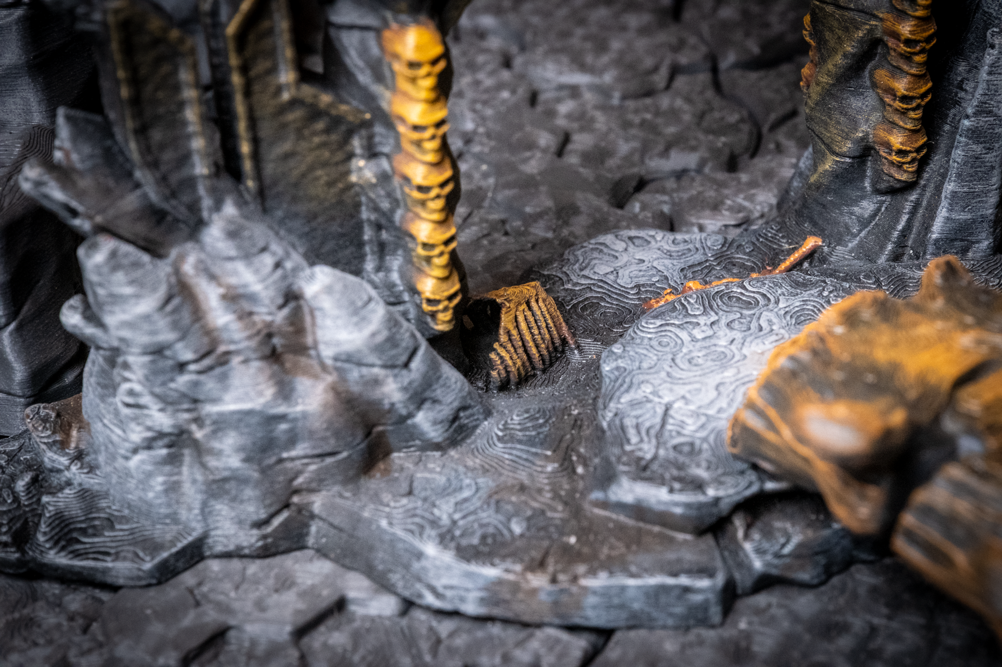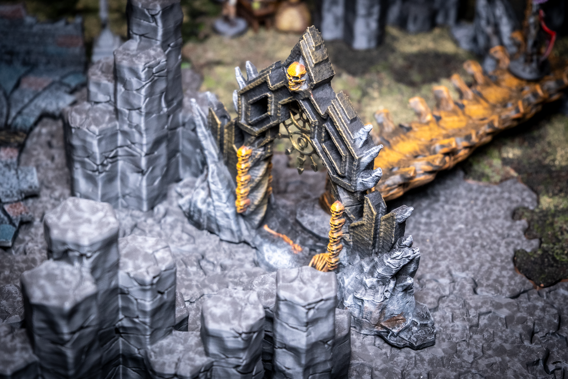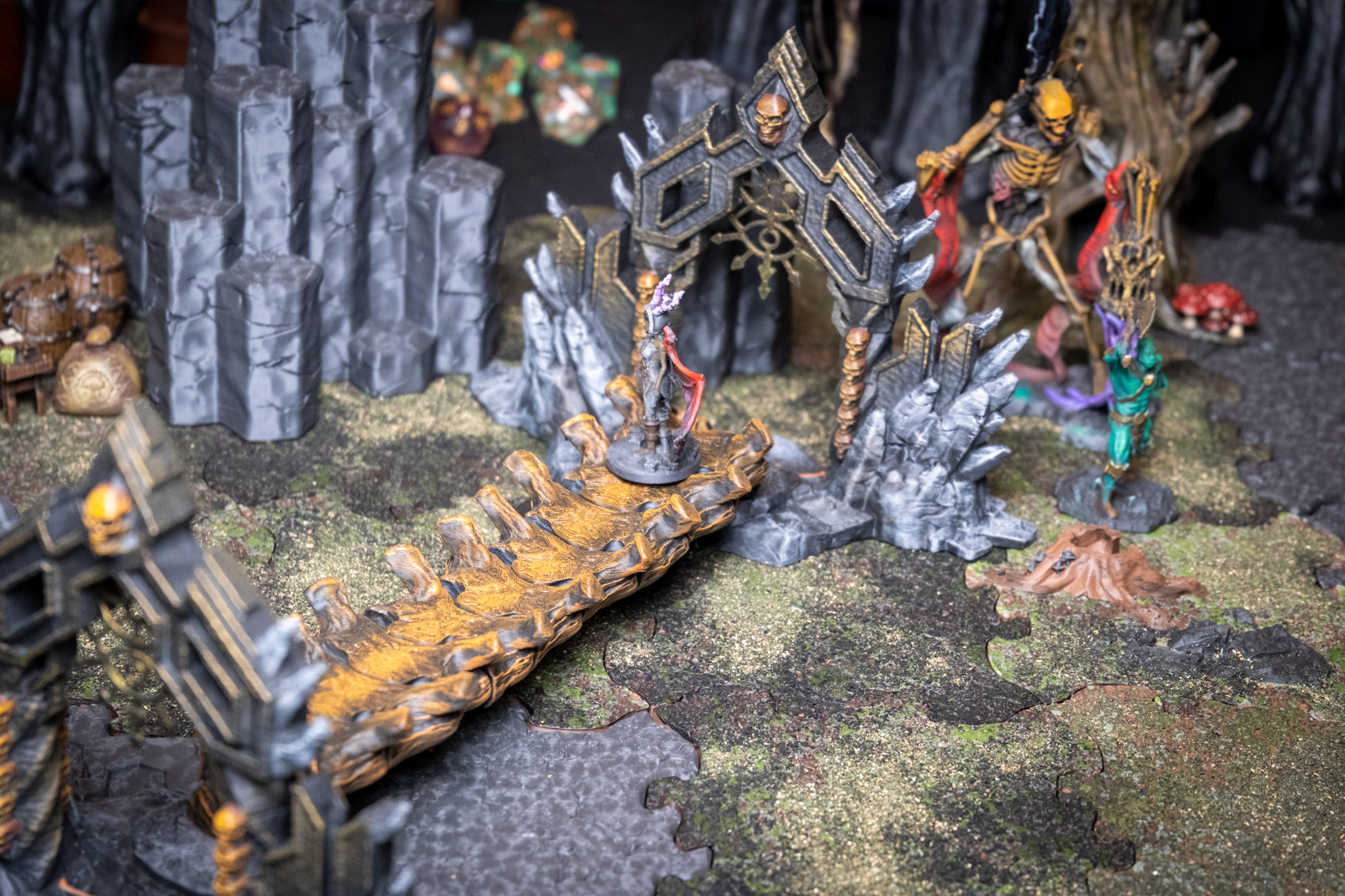 Crafted from the remains of a long-dead ancient dragon, the Bone Bridge spans chasms of shadow and flame with eerie grandeur. Each rib-like arch and spine-textured beam evokes the remains of ancient beasts—or something far worse. This haunting centerpiece adds instant tension and dark mystique to your tabletop. Ideal for Necromancer lairs, cursed catacombs, underworld crossings.